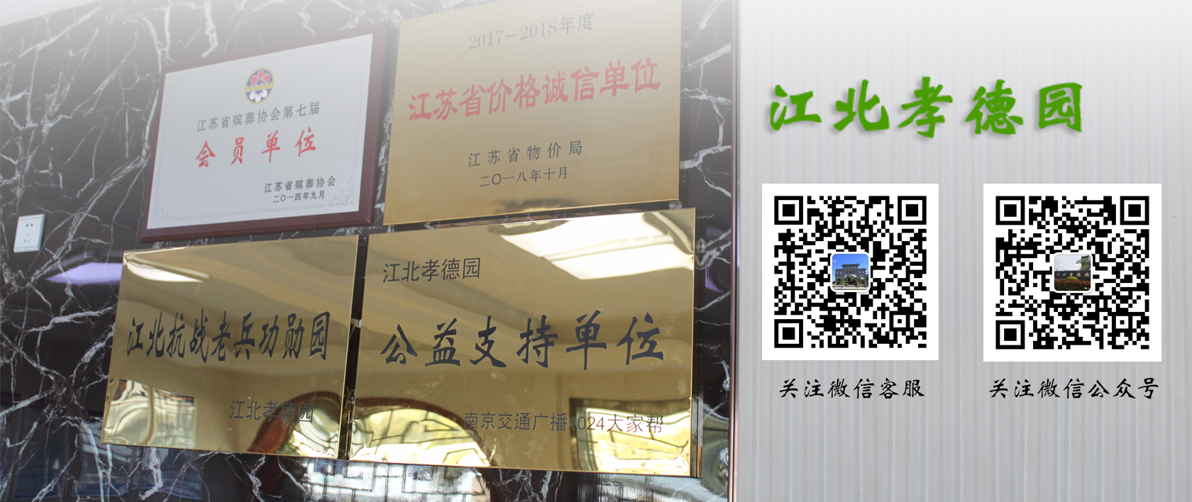 江北孝德園位于南京市六合區(qū)殯儀館南側(cè),是經(jīng)江蘇省民政廳批復(fù)、六合區(qū)唯一一家正規(guī)的經(jīng)營(yíng)性公墓,2018年榮獲江蘇省物價(jià)局頒發(fā)的“江蘇省價(jià)格誠(chéng)信單位”,是江蘇省殯葬協(xié)會(huì)會(huì)員單位、南京交通廣播1024大家?guī)凸嬷С謫挝?,也是江北地區(qū)最后一塊碑式陵園。